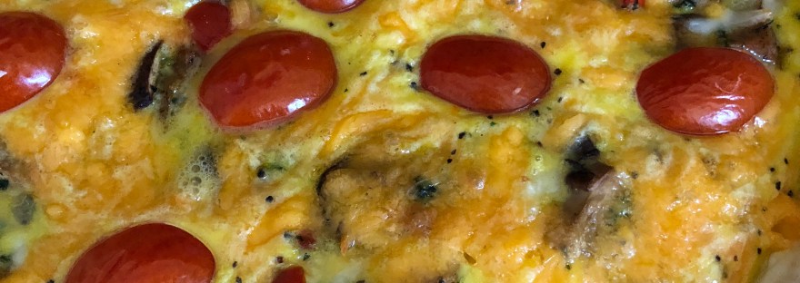 The next step is the all important cheese and decorating step. I had a little bit of jack cheese left in the fridge and I mixed that into the filling before I added the eggs and then topped with some cheddar and sliced cherry tomatoes. It made for a pretty pre-bake picture. And an even prettier post-bake shot.