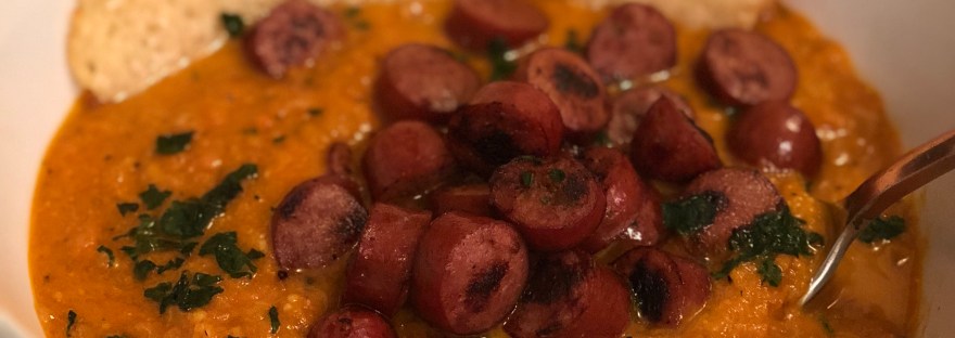 This one was fairly straightforward, while the soup was finishing off in the crockpot I chopped up some smoked sausage I had in the fridge and cooked it in a pan on the stove. My secret for cooking meat like this are a few splashes of low sodium chicken stock. It helps deglazes the pan and lets you steam rather than roast so they don’t dry out. This billowing cloud above my pan is steam, not smoke. I promise.